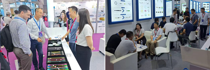 展会期间,吴通展位前人头攒动,来自东南亚、欧洲、中东及国内设备商龙头企业及工程集成商等客户纷至沓来,重点咨询隐形光缆的技术参数与应用案例。